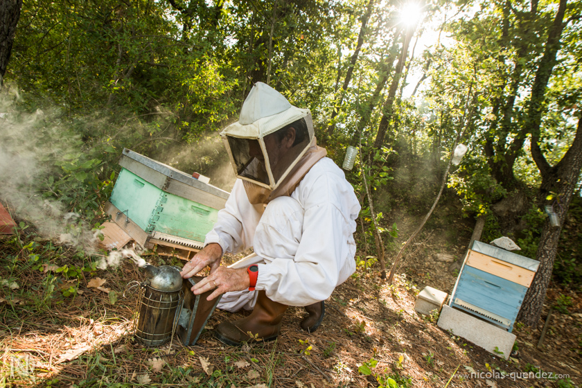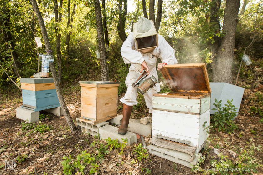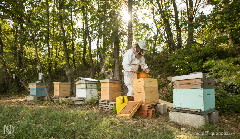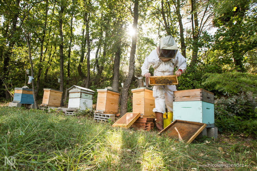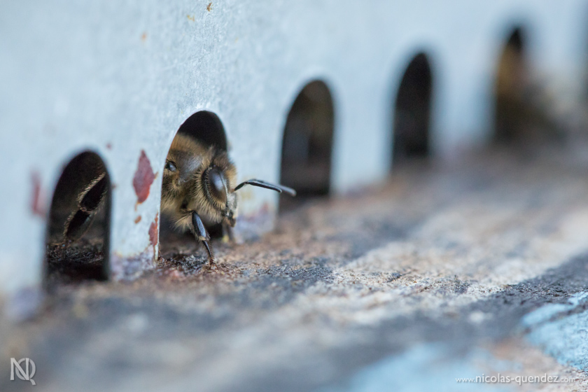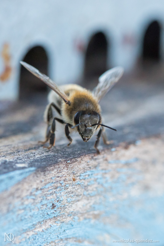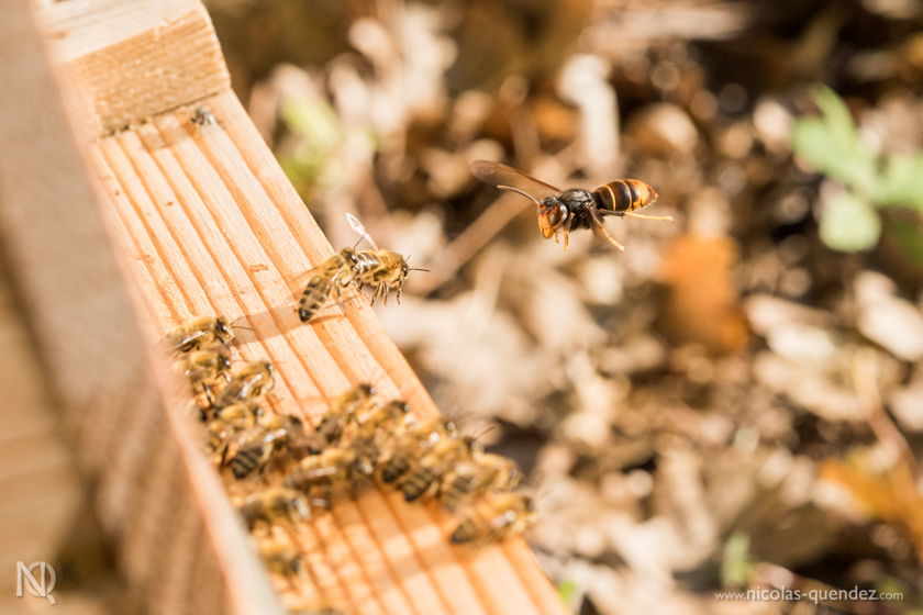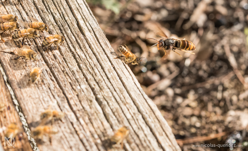 Toujours loin de la Guyane, quelques photos d’un apiculteur essayant tant bien que mal de sauver ses ruches, attaquées par les frelons asiatiques. Les frelons se postent à l’entrée des ruches, attaquent les abeilles en vol pour les tuer et les ramener dans leur nid… Quelques clichés de frelons asiatiques en vol juste devant la ruche. Les abeilles essayent de se défendre, sans succès…